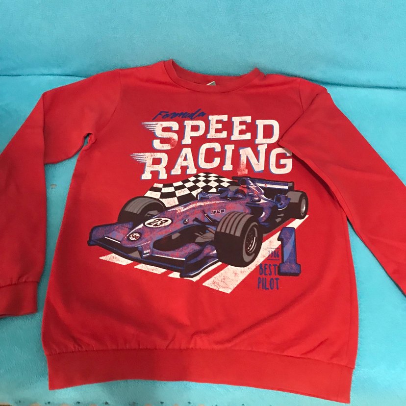 Uzun kollu, bisiklet yaka, kırmızı renkli, oturan kesim erkek sweatshirt. Üzerinde renkli yarış arabası ve "SPEED RACING" baskısı bulunur. ️
