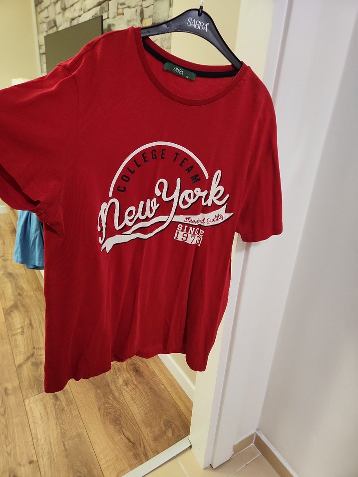 Kırmızı pamuklu erkek tişörtü, kısa kollu ve bisiklet yaka. Renkli baskılı desen ve nornal kesimle rahat bir sokak stili sunar. 2XL