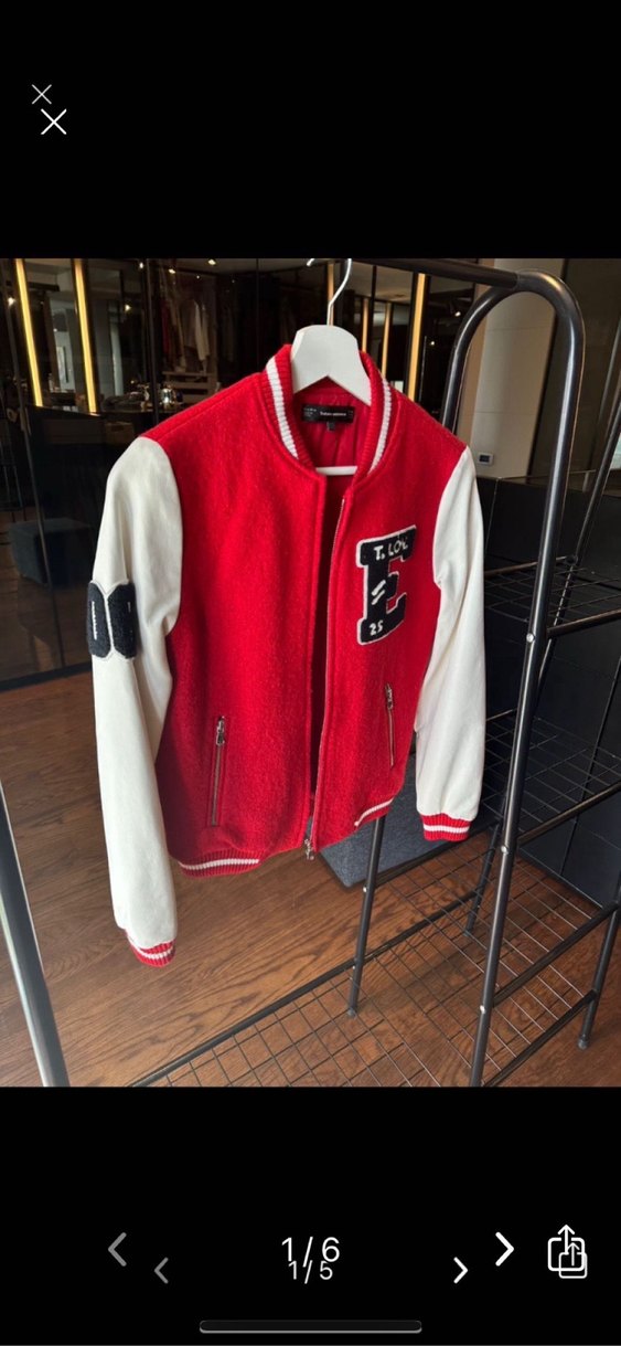 kolunda aşınma var Kırmızı baskılı, beyaz uzun kollu, fermuarlı ve bisiklet yakalı kadın spor tarzı, normal uzunlukta dar kesim ceket.