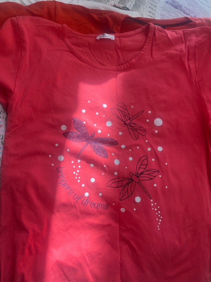 Kırmızı, pamuk kumaştan, kısa kollu ve bisiklet yaka hamile tişörtü. Renkli bohem tarzı, yusufçuk baskısı ve 'wings of dreams' yazısı içerir.