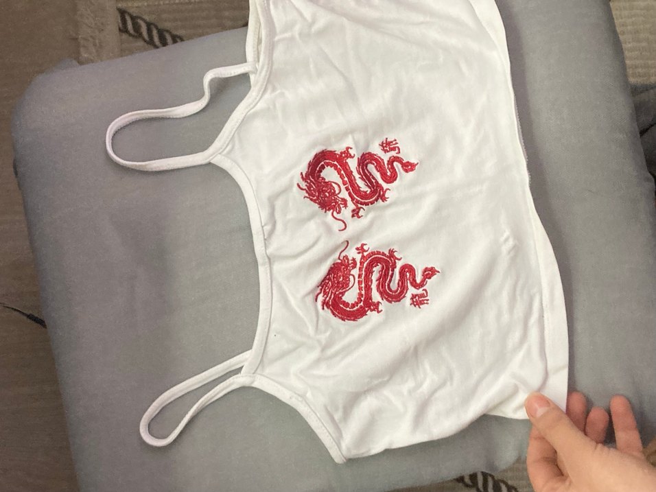 Pamuklu, kırmızı, baskılı ejderha desenli, askısız ve kolsuz, normal boyda, sokak modasına uygun kadın atlet.