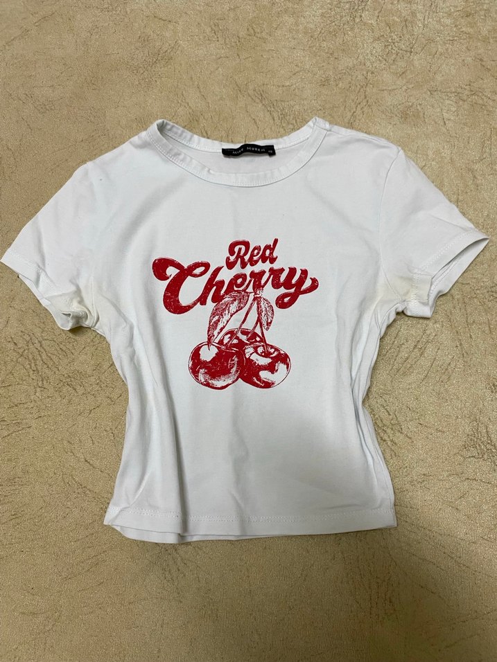 Pamuk kumaştan, kısa kollu, bisiklet yaka ve parlak kırmızı 'Red Cherry' baskılı, fitted kesim kadın tişörtü.