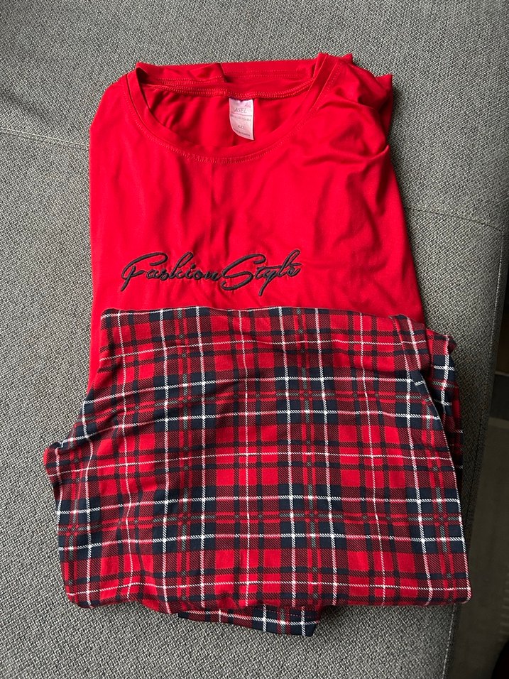 Uzun kollu, bol kesim kadın pijama takımı. Üst kısmı kırmızı ve baskılı, alt kısmı koyu kırmızı ekose desenli. Rahat ve konforlu, evde dinlenmek için ideal.