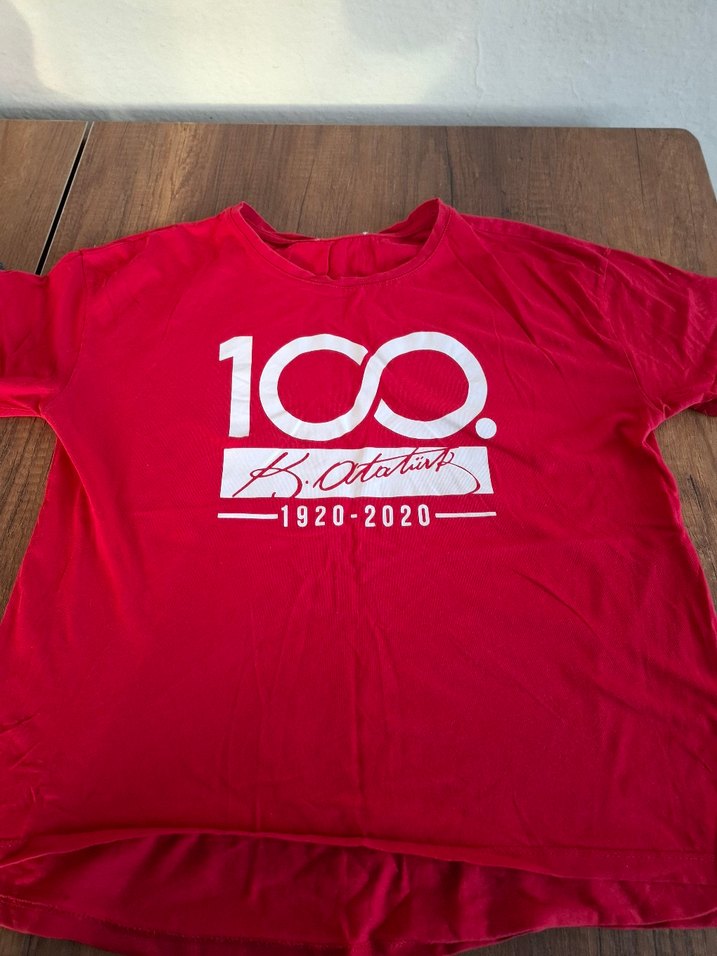 Pamuk kumaştan, kısa kollu ve yuvarlak yaka kırmızı tişört. 1920-2020 baskılı, bol kesim ve spor tarzda. Birkaç defa giyilmiştir.