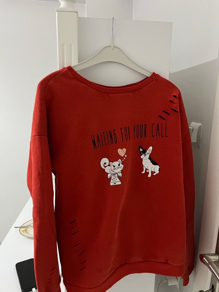 Bu bol kesim, uzun kollu kadın sweatshirtü, yuvarlak yaka ve yumuşak, sıcak örme kumaşa sahiptir. Koyu kırmızı renkte, fare ve köpek baskısı ile 'WAITING FOR YOUR CALL' yazısı bulunur. Rahat ve günlük kullanıma uygundur.