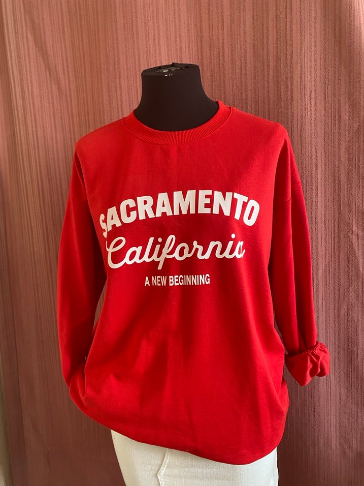 Kırmızı, uzun kollu, yuvarlak yakalı sweatshirt. "SACRAMENTO California A NEW BEGINNING" baskılı, pamuklu, rahat kesim ve günlük kullanıma uygun.