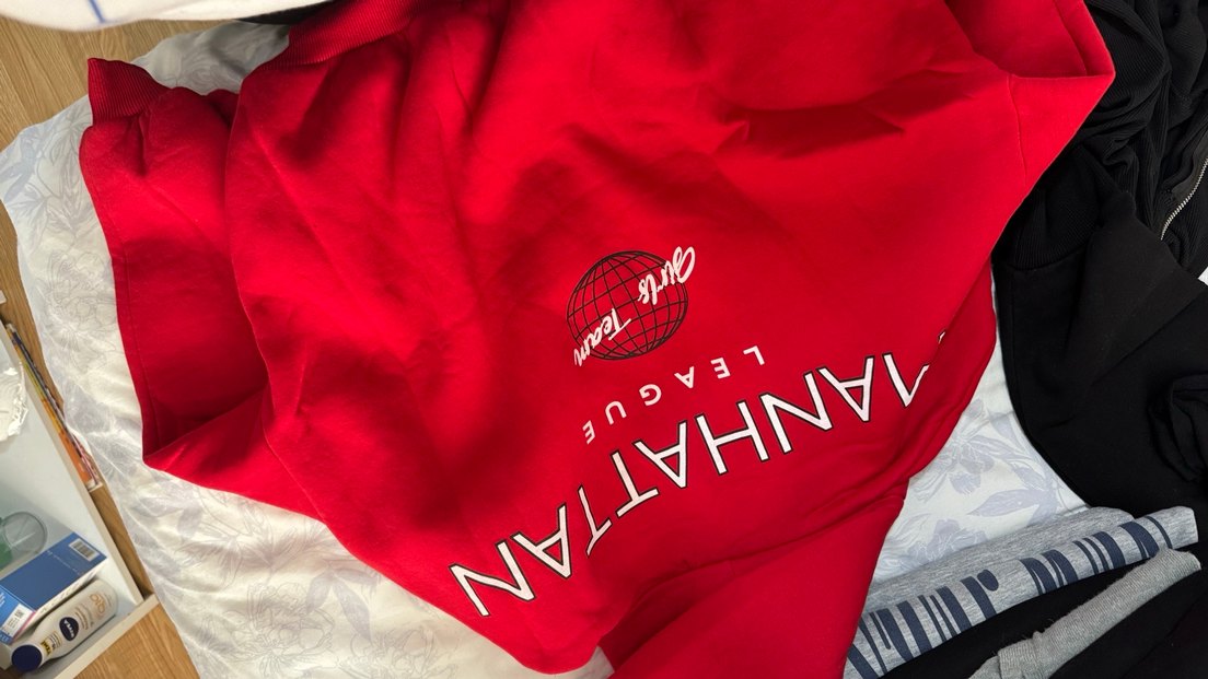 Kırmızı, baskılı, uzun kollu, fermuarlı ve dar kesim kadın sweatshirt. Suni kumaştan, günlük ve sokak stiline uygun.