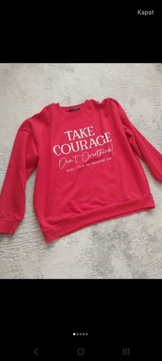 1 kez kullanıldı marka temsilidir Pamuk kumaştan, uzun kollu ve yuvarlak yakalı kırmızı sweatshirt. Renkli baskılı 'TAKE COURAGE Don't Overthink' yazısıyla rahat ve şık bir görünüm sunar.