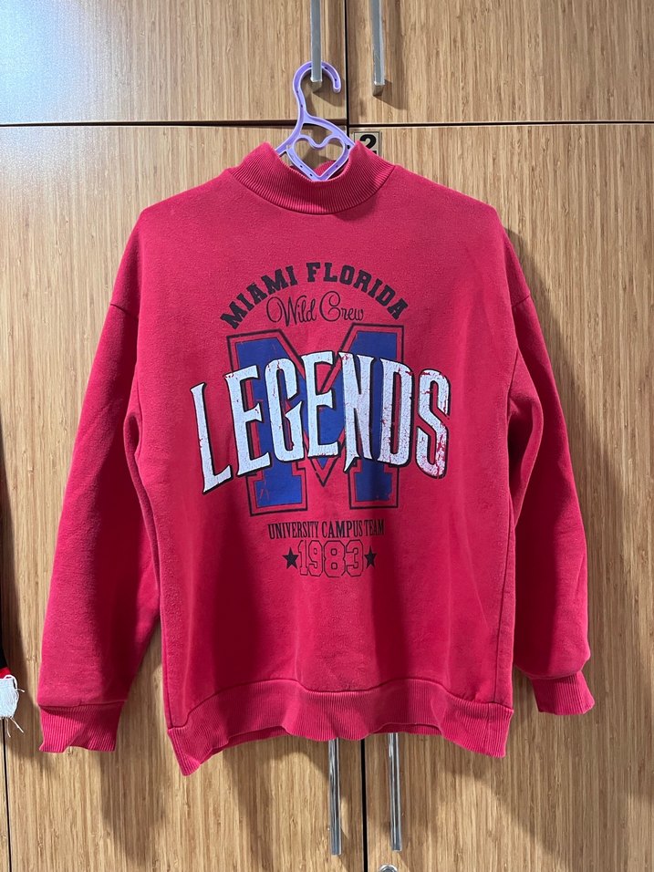 Kırmızı uzun kollu, bisiklet yaka ve bol kesim sweatshirt, renkli "LEGENDS" ve "1983" baskısına sahiptir. Yumuşak, örme tüylü kumaştan üretilmiştir.