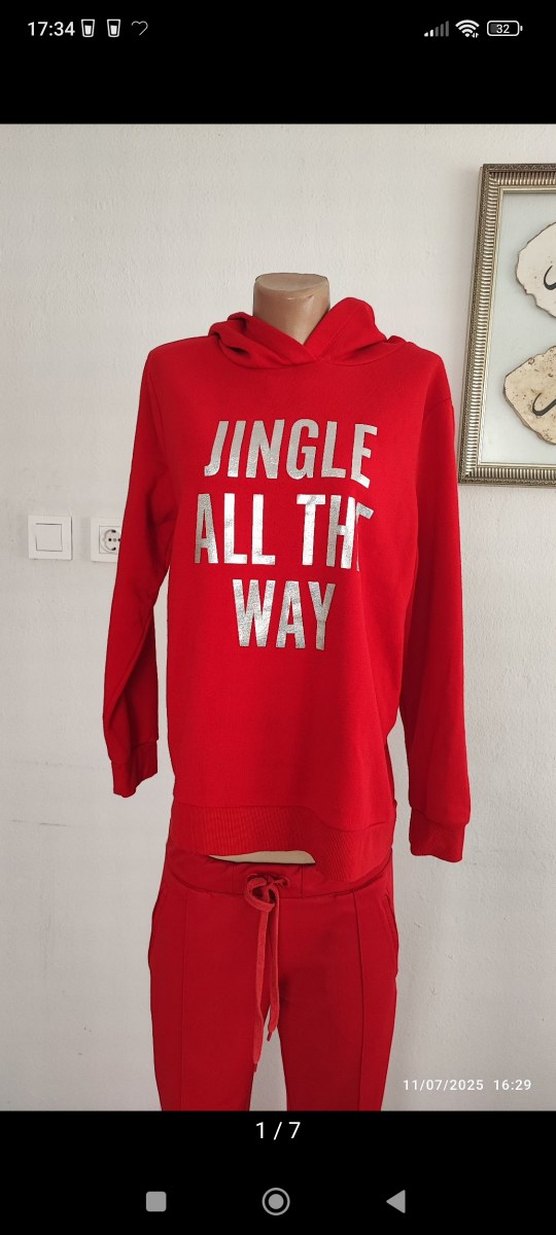 Kırmızı kadın sweatshirt, yuvarlak yaka ve uzun kolludur. 'JINGLE ALL THE WAY' baskılı, bol kesim ve kısa boydadır. Yumuşak ve sıcak kumaştan, kemerli detaylıdır.