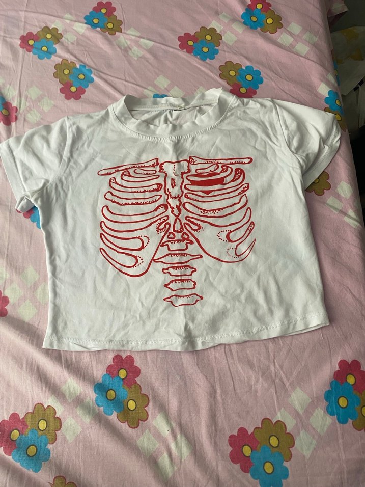 fitted kesim, yakalı ve kısa kollu, yumuşak sentetik kumaştan kırmızı iskelet baskılı goth punk tarzı gömlek.