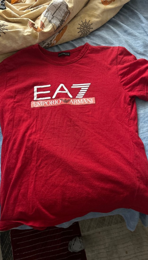 Kısa kollu, bisiklet yaka, pamuklu kırmızı tişört. Emporio Armani EA7 baskılı, parlak görünüm sunar. Trendy ve şık günlük kullanım için uygun.