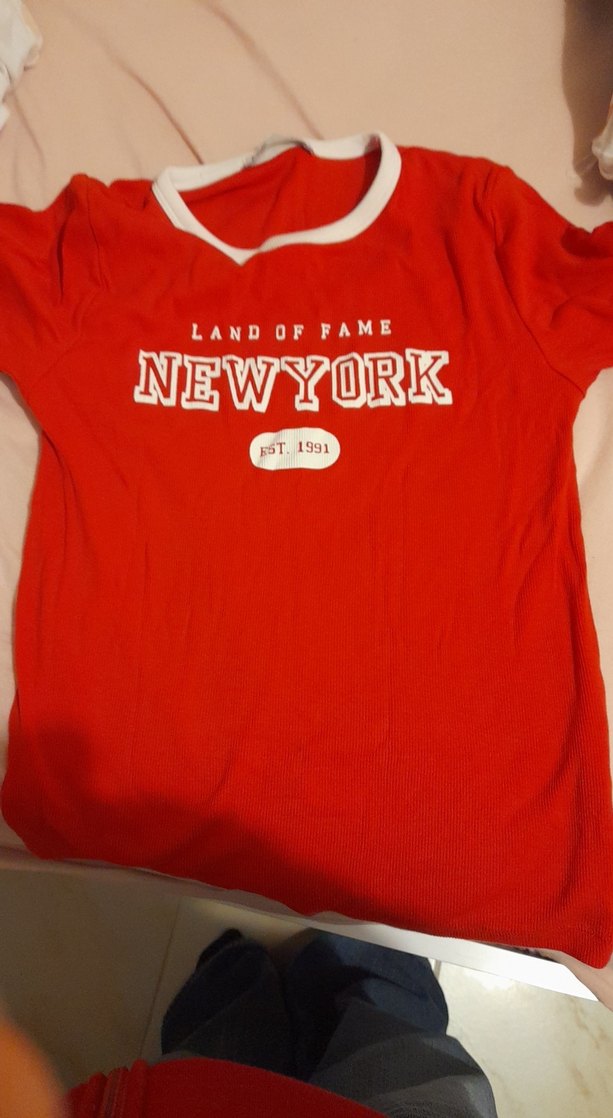 Kısa kollu, yuvarlak yaka kırmızı pamuk tişört, "NEWYORK" baskılı ve "LAND OF FAME EST. 1991" yazılı, rahat ve şık bir sokak stili sunar.