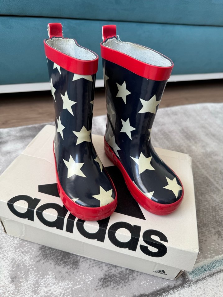 Koyu kırmızı kenarlara ve baskılı yıldız desenine sahip lastik erkek-kız çocuk botları. Kolay kullanım için cırt cırtlı kapanışlıdır.