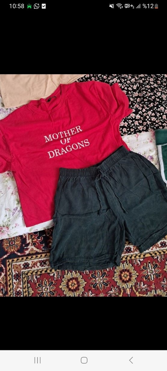Pamuklu, kısa boy, bol kesim hamile şortu, üzerinde 'MOTHER OF DRAGONS' baskılı kırmızı tişörtle. Rahat ve bohem tarzda günlük kullanım için uygun.