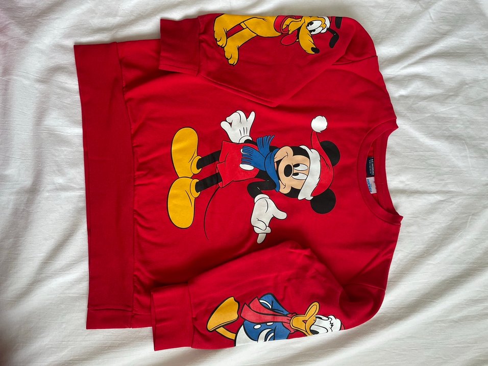 Uzun kollu, bisiklet yaka, renkli Disney baskılı kırmızı erkek sweatshirt. Yeni yıl konseptli trend rahat stil için uygun.