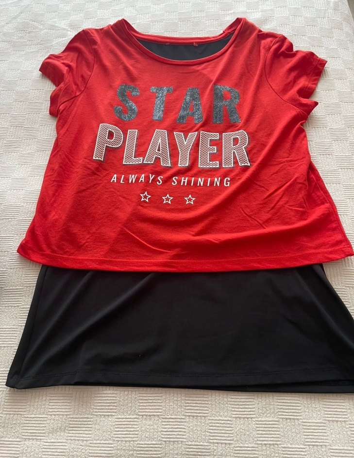 Parlak kırmızı renkli, askısız yakalı ve kısa kollu, bol kesim hamile tişörtü. Önünde 'STAR PLAYER ALWAYS SHINING' baskısı bulunur.