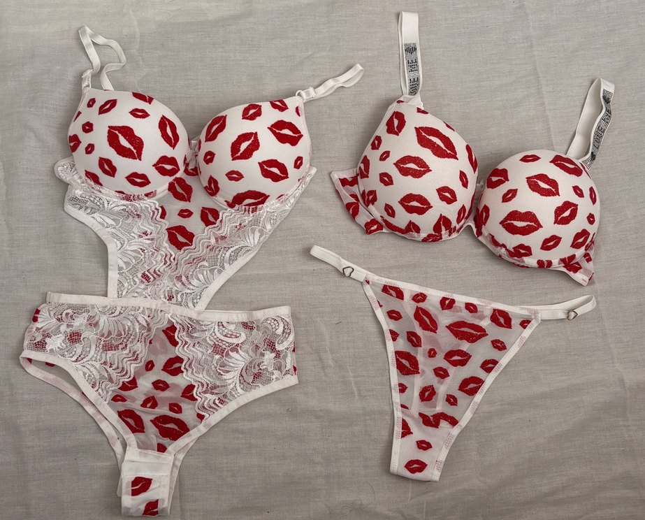 Kırmızı dudak baskılı, kısa kesim sütyen ve dantelli külot takımı, ışıltılı ve çağdaş tasarım sunar.