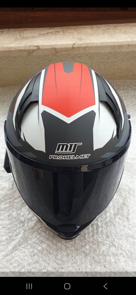 Kırmızı, siyah ve beyaz renklerde baskılı MT Prohelmet motosiklet kaskı. Dayanıklı plastikten üretilmiş, tokalı ve karartılmış vizörlü. ️