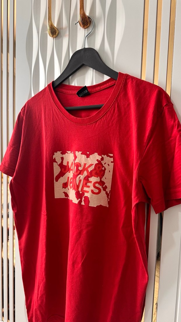 Kısa kollu, bisiklet yaka ve baskılı tasarımlı kırmızı oversize erkk tişörtü. Yumuşak dokulu kumaştan, rahat ve gündelik stil için ideal.