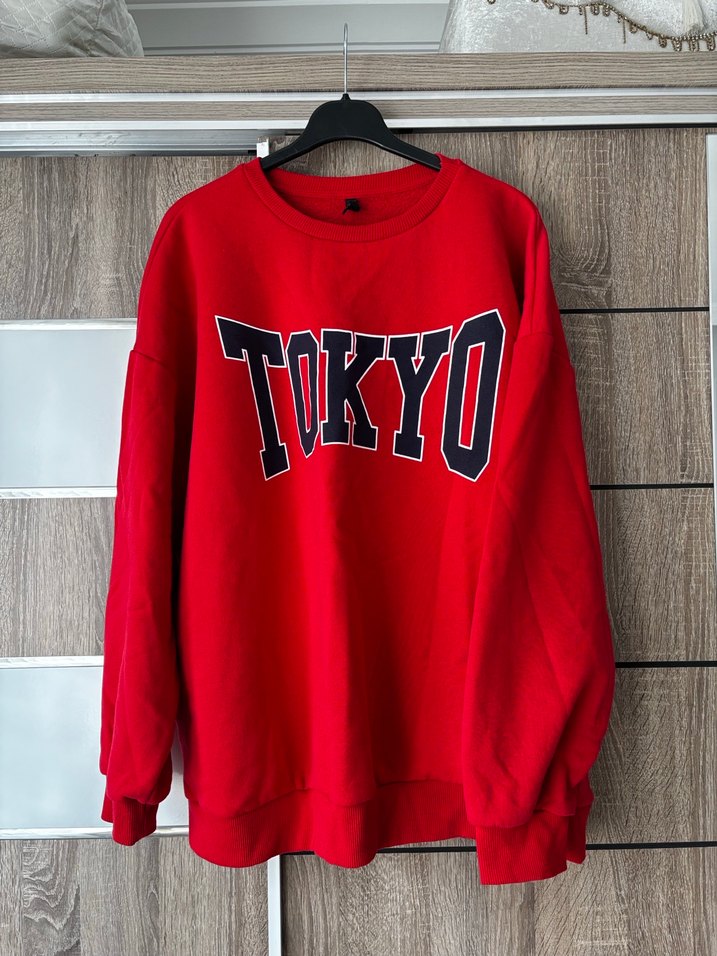 Kırmızı renkte, uzun kollu ve yuvarlak yakalı, bol kesim bir sweatshirt. Yumuşak sentetik kumaştan üretilmiş ve 'TOKYO' baskısına sahip. Günlük sokak stiline uygun.