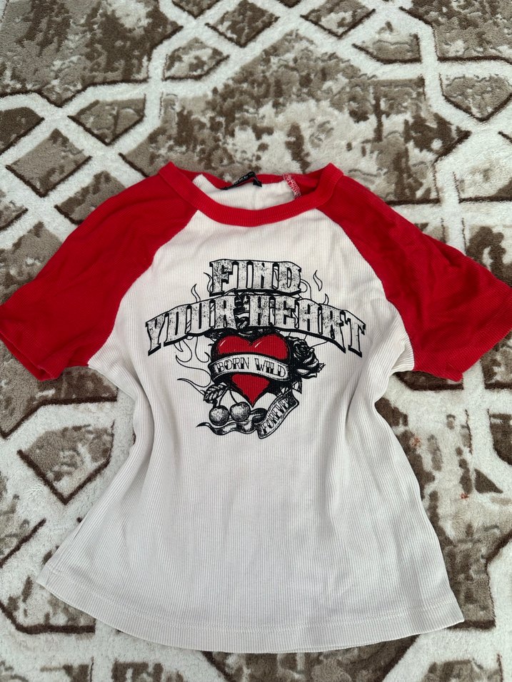 Pamuk kumaştan, kısa kollu ve yuvarlak yakalı, bol kesim kadın tişörtü. Koyu kırmızı ve beyaz renkte baskılı rock punk desenlidir. Günlük kullanıma uygun.