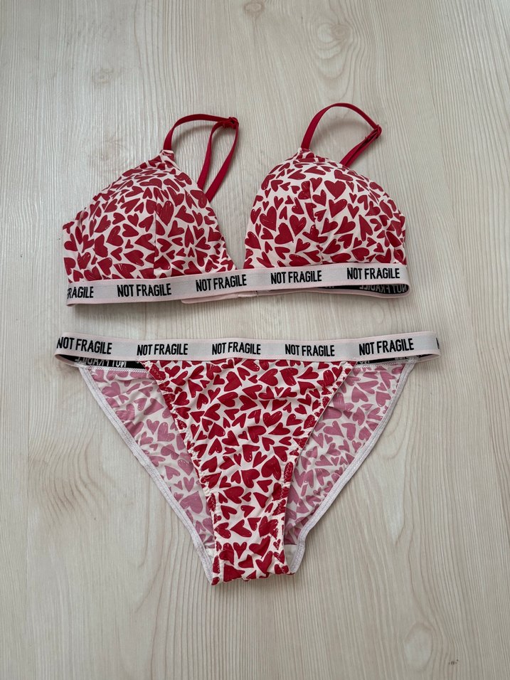 Kırmızı kalp desenli baskılı sütyen ve külot takımı, 'NOT FRAGILE' yazılı elastik bantlarla athleisure ve street wear tarzını birleştirir. ❤️