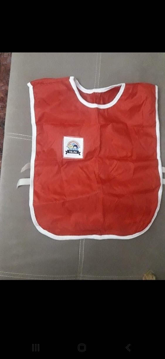 Beyaz kenarlıklı, renkli baskılı kırmızı suluboya önlüğü. Yumuşak kumaştan, basatan geçirmeli kenarları cirtcirtli, marka temsili.