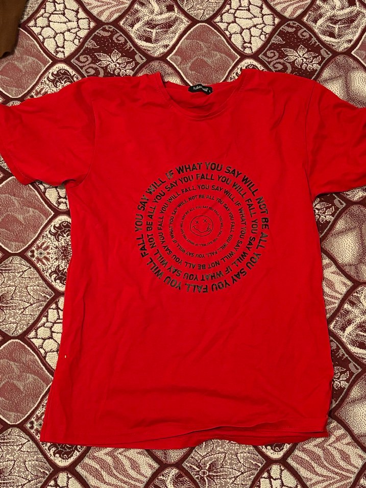 Kırmızı renk, kısa kollu, yuvarlak yaka ve bol kesim kadın tişörtü. Baskılı dairesel yazı deseni ve bohem tarzıyla günlük kullanıma uygundur.