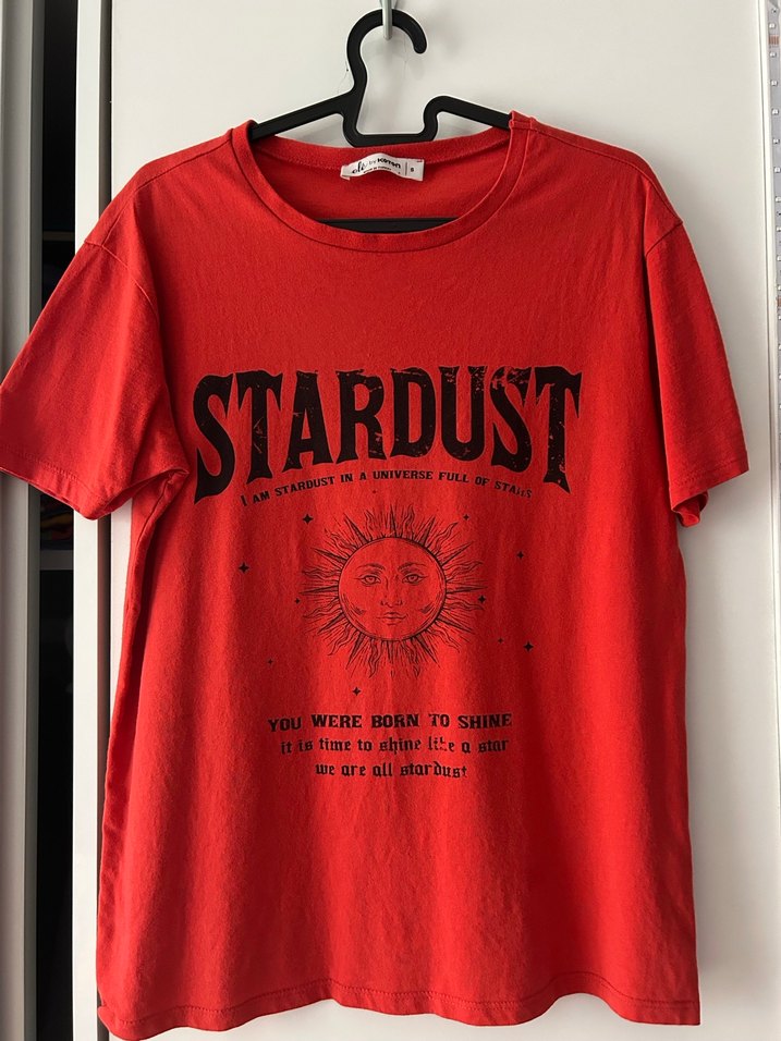 Kırmızı tişört, kısa kollu ve yuvarlak yaka.