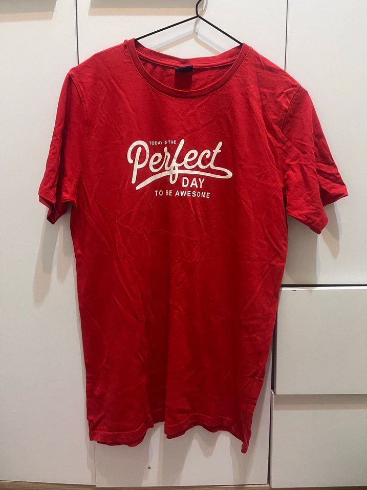 Kırmızı renkli tişörtü, 'Perfect Day to Be Awesome' baskısına sahip. Kısa kollu, yuvarlak yaka ve bol kesimdir, sentetik kumaştan üretilmiştir.