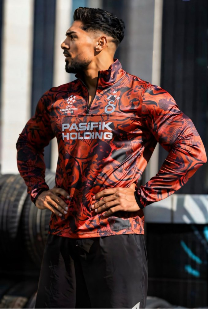 Kırmızı baskılı desenli, yüksek yakalı ve uzun kollu erkek formda tişört. Sentetik kumaştan, sokak stili ve spor şıklığını bir arada sunar. Önünde 'PASIFIK HOLDING' ve 'HOLDING' yazıları bulunur. ♂️ S-M-L-XL-XXL BEDENLERİ MEVCUTTUR.