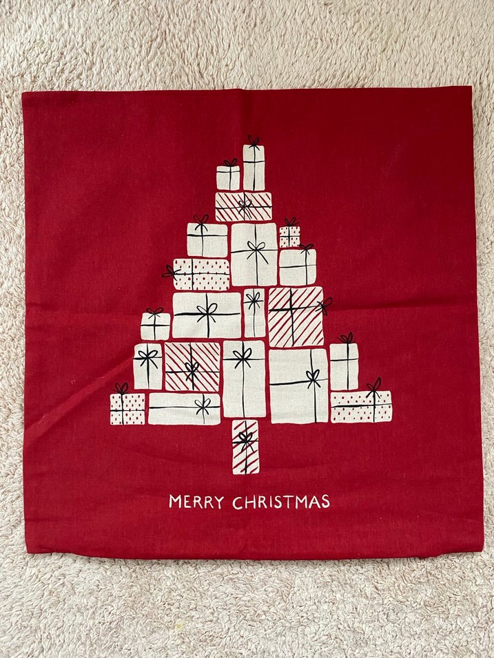 H&m home Kırmızı renkte, Üzerinde hediye kutularından oluşan yılbaşı ağacı ve "MERRY CHRISTMAS" yazısı bulunur.