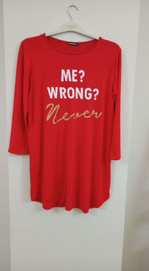 Uzun kollu, yuvarlak yakalı kırmızı tişört"ME? WRONG? Never" baskılı, rahat kesim ve örme keten kumaştan üretilmiştir. Günlük kullanıma uygundur. penye kumasdir sayılı kullanıldı