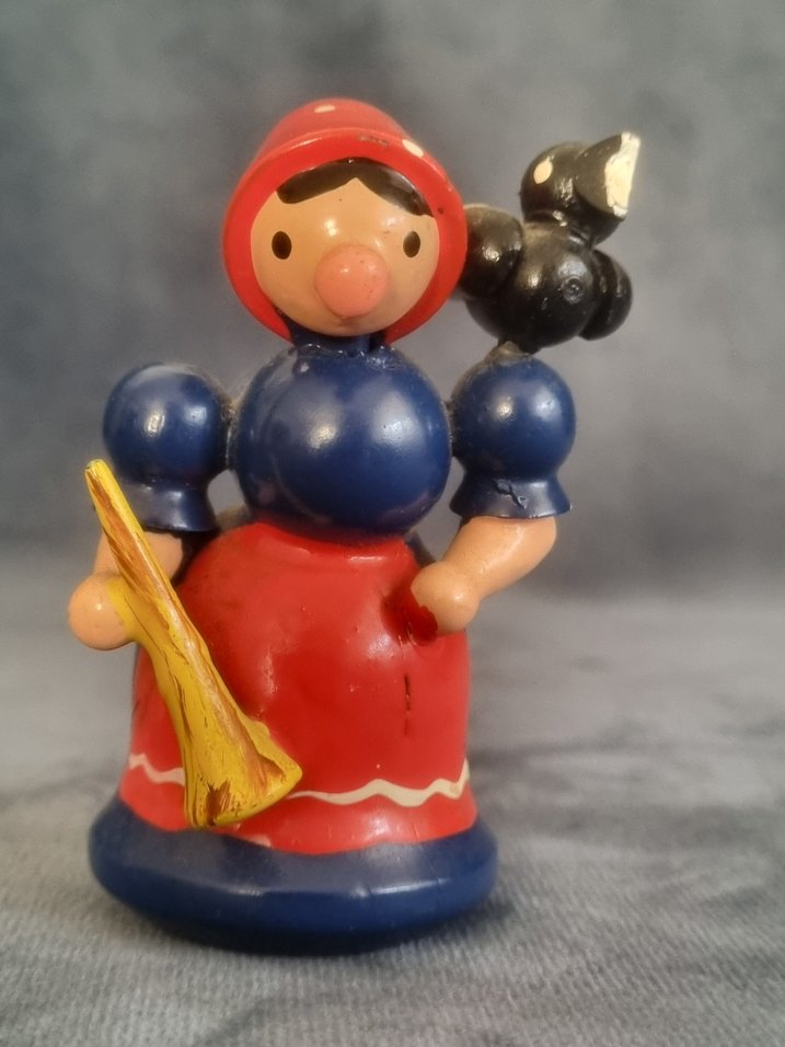 Kırmızı başlıklı, mavi elbiseli ahşap figürin, elinde sarı bir boru ve kolunda siyah bir kuş bulunuyor.