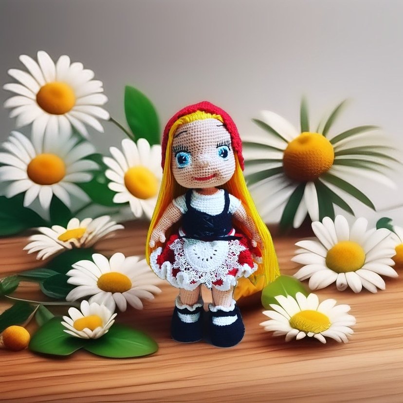 Uzun sarı saçlı, kırmızı kapüşonlu ve dantel detaylı el örgüsü renkli bebek. Dekoratif çiçeklerle çevrilidir.