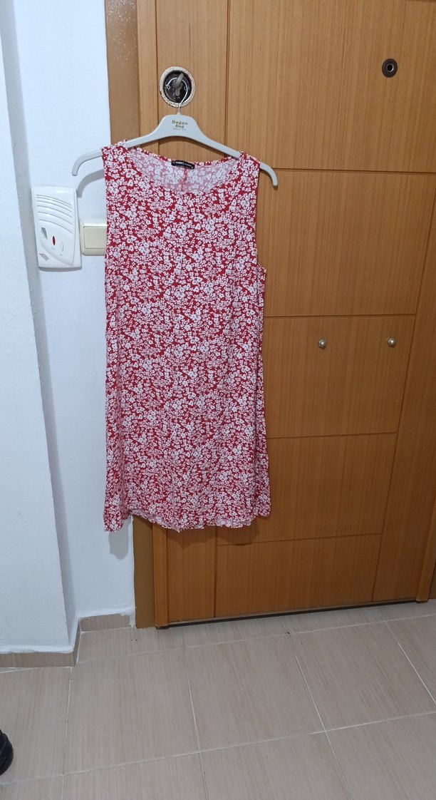 Pamuk kumaştan, kolsuz, V yaka ve bol kesim midi elbise. Kırmızı batik desenli ve drapeli, günlük bohem tarz için uygun .HEDIYE GELDİ BEDEN OLMADI
