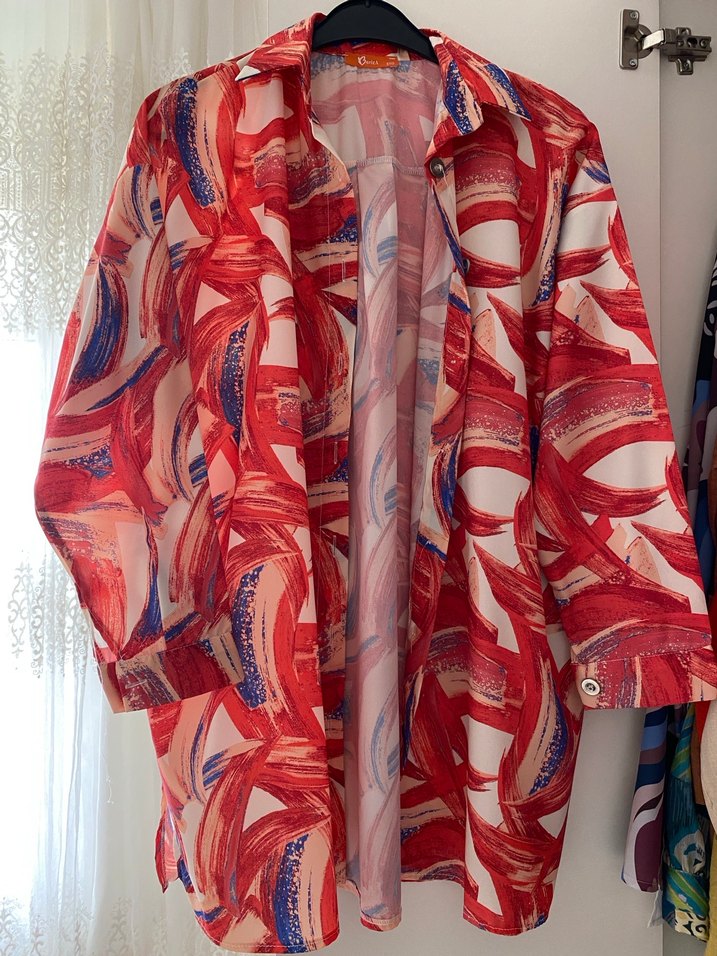 Kırmızı batik desenli, uzun ve dökümlü bohem tarzı kadın gömleği. Uzun kollu ve kesik yakalı, rahat ve hafif tekstil kumaştan üretilmiştir. Tunik gömlek