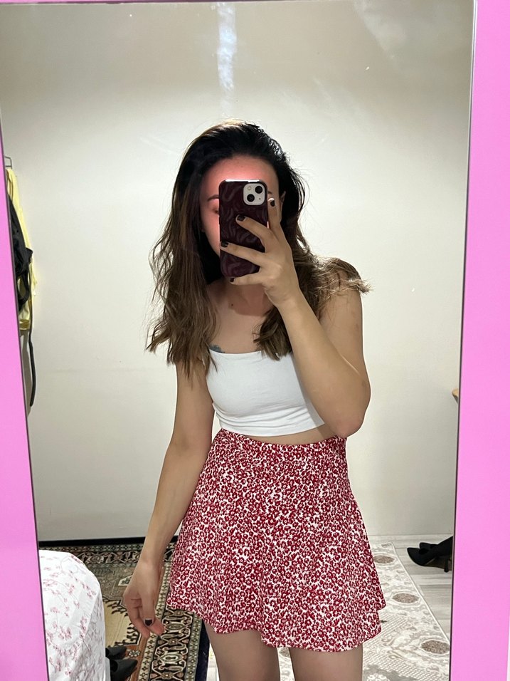 Yumuşak pamuk kumaştan, açık kırmızı batik desenli, bohem ve minimalist tarzları birleştiren, dar kesim mini etek. Boy 1.60 kilo 58