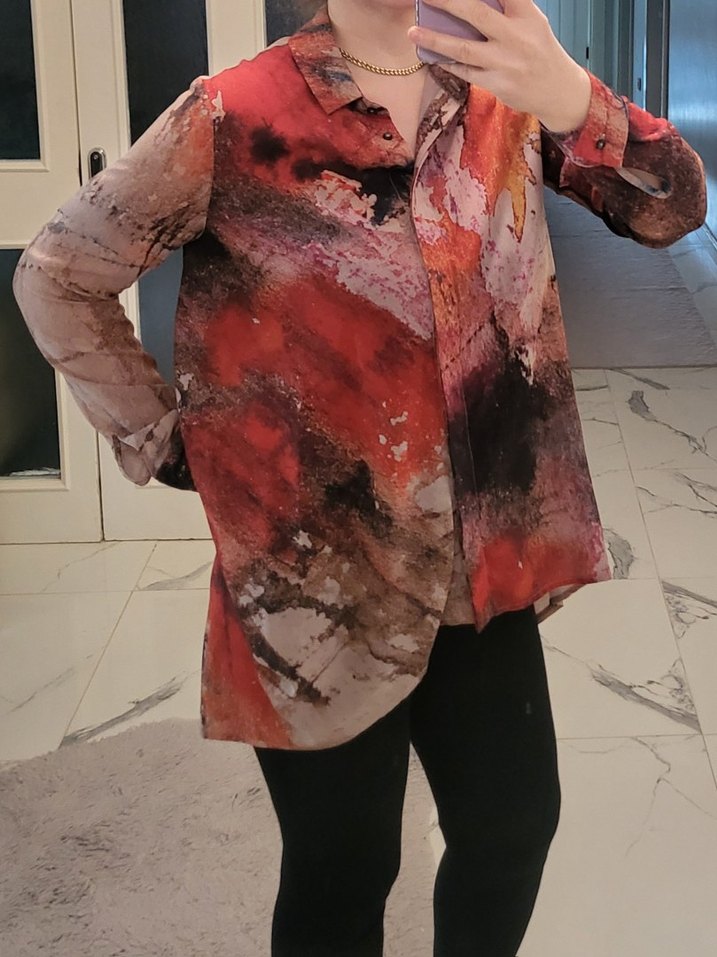 Kadınlar için salaş kesimli, yakalı ve uzun kollu, midi boyda, ipeksi dokuda kırmızı batik desenli drapeli gömlek. Günlük sokak stili için uygundur.