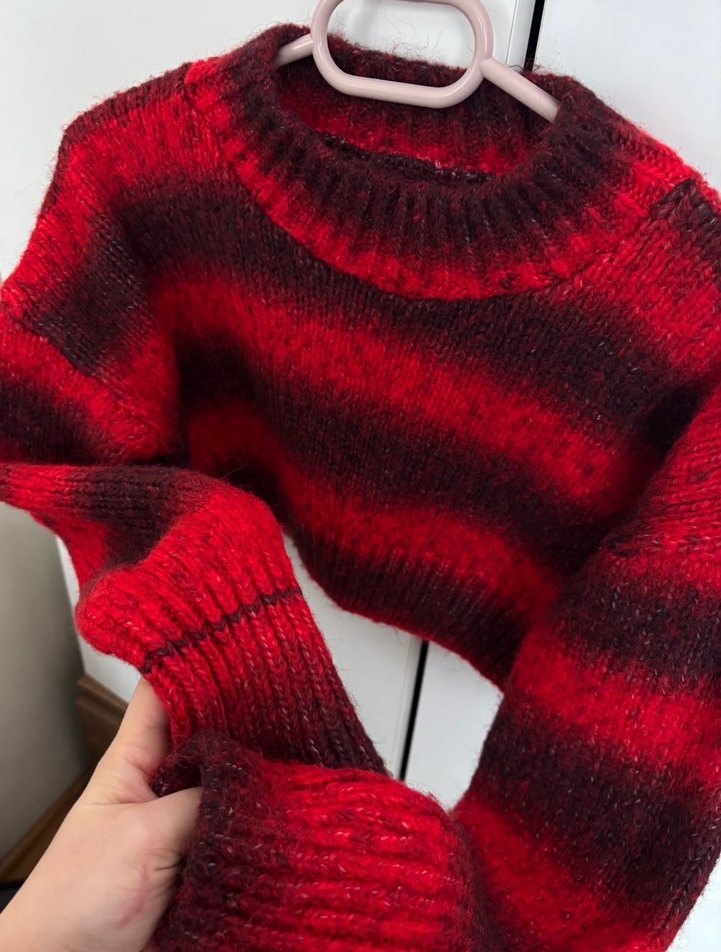 Koyu kırmızı batik desenli, yuvarlak yaka ve uzun kollu kadın triko kazak. Rahat kesimli ve normal boyda, yumuşak örgü kumaştan bohem tarzda.