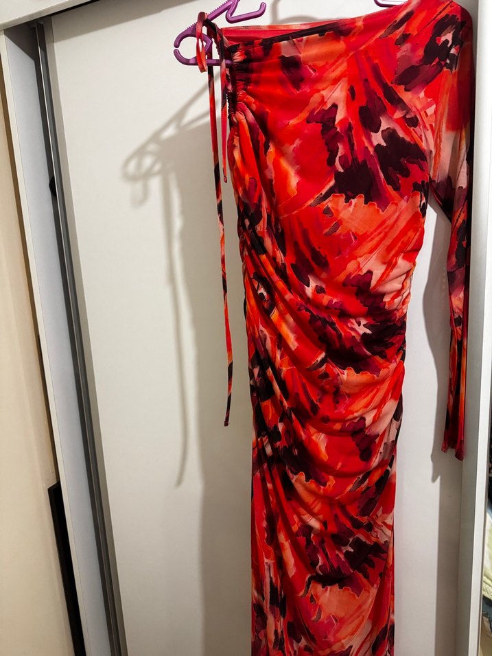Kırmızı Batik Desenli Uzun Drapeli Elbise