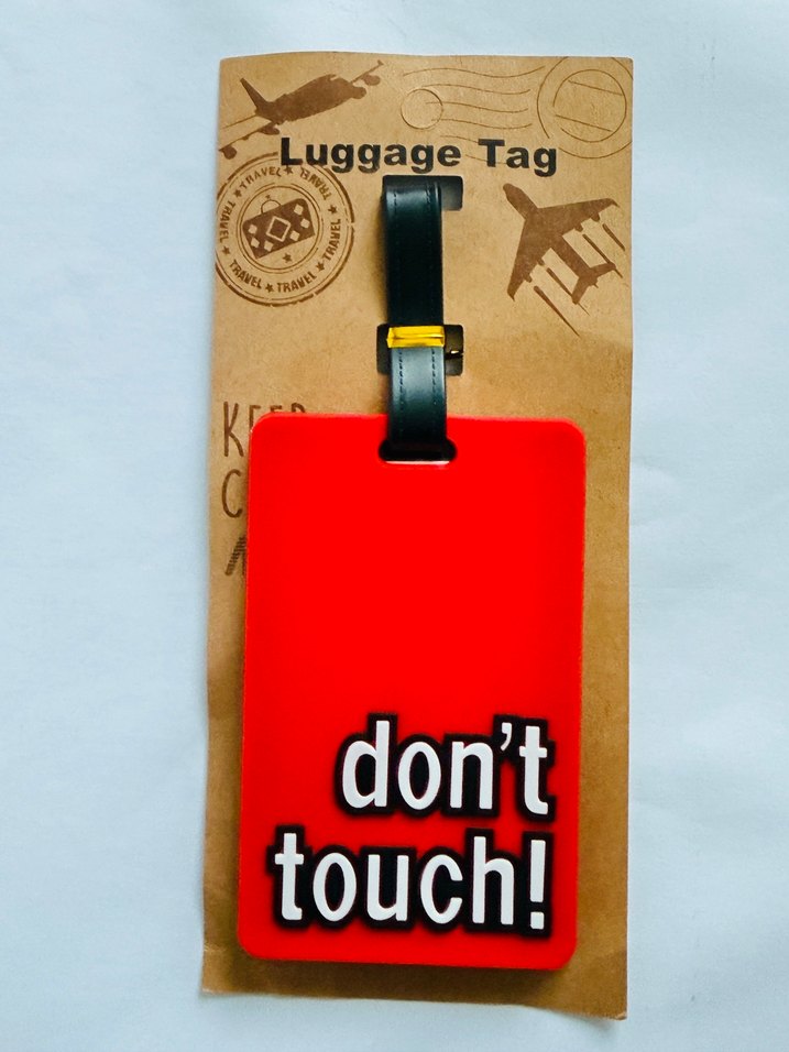 Canlı kırmızı renkte, üzerinde "don't touch!" yazan bavul etiketi. Çantaya kolayca takılabilen askısı bulunur.