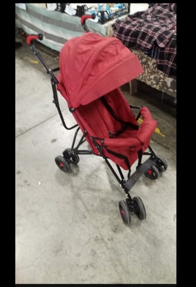 Kırmızı bebek arabası, hafif çerçeve ve ayarlanabilir tente ile. Rahat oturma yeri ve güvenlik kemeri bulunur. cok hafif ve cok kullanışlıdır hiçbir sorunu yok frenleri ve katlanma yerleri sorunsuz çalışır.