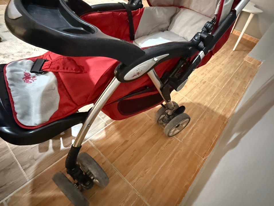 Koyu kırmızı renkte, sağlam yapılı ve rahat oturma alanına sahip bebek arabası, kolay kullanım ve güvenlik sunar. Kullanıma hiç bir engeli yoktur