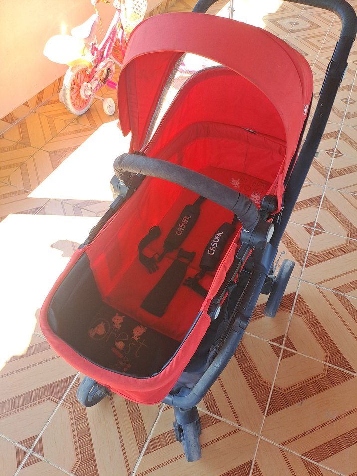 Koyu kırmızı tente ve oturma alanına sahip bebek arabası, koruyucu ön bar ve ayarlanabilir emniyet kemeriyle güvenlik sağlar. Dayanıklı yapısı ve rahat tasarımıyla kolay kullanım sunar.