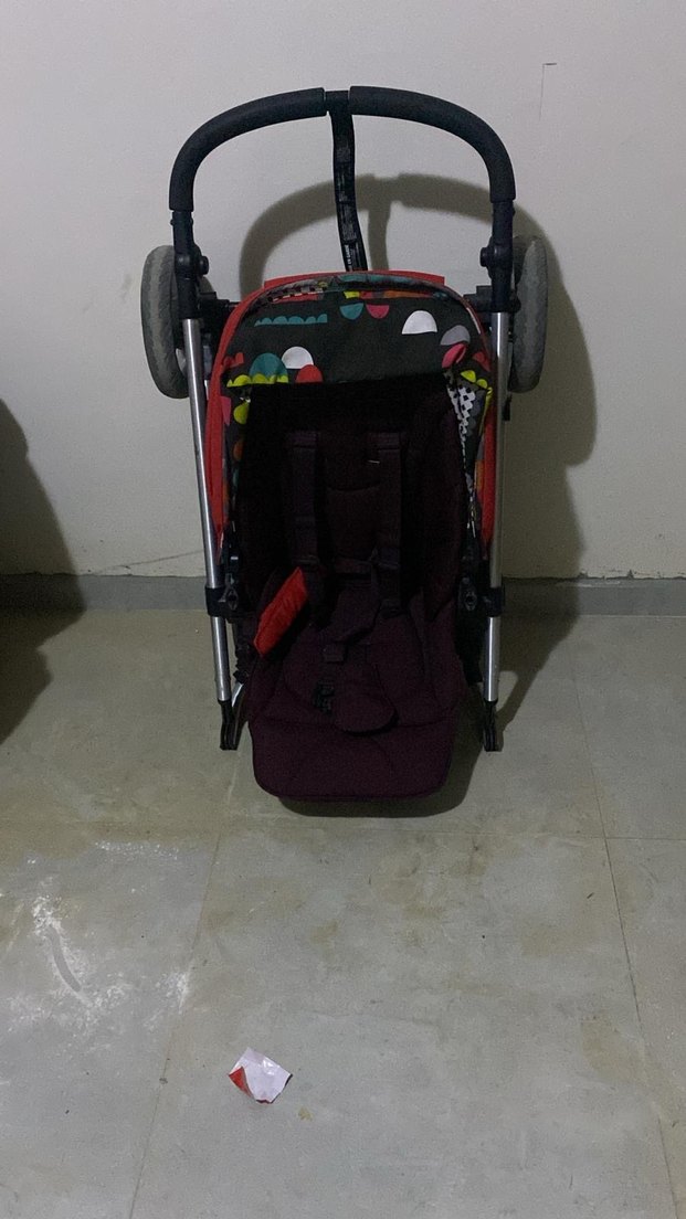 Koyu kırmızı renkte, emniyet kemeri ve yastıklı oturma alanı bulunan, renkli tente tasarımlı bebek arabası.