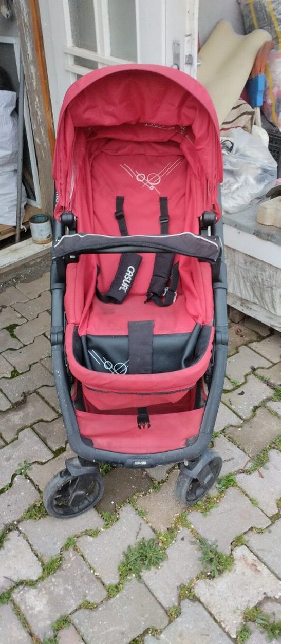 Koyu kırmızı renkte, emniyet kemerleri ve ön barı olan yastıklı bebek arabasıdır. Dış mekan kullanımı için sağlam tekerleklere sahiptir.