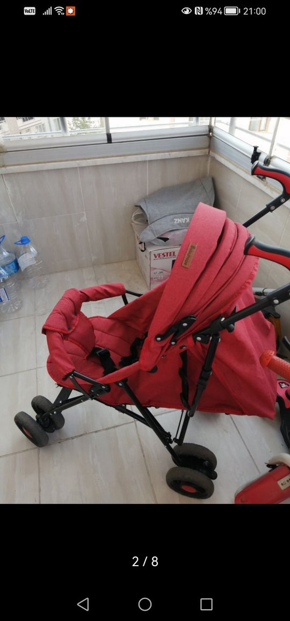 Renkli tasarımlı, dayanıklı iskelete sahip kırmızı bebek arabası. Rahat kullanım ve kolay manevra için çoklu tekerlekler bulunur.