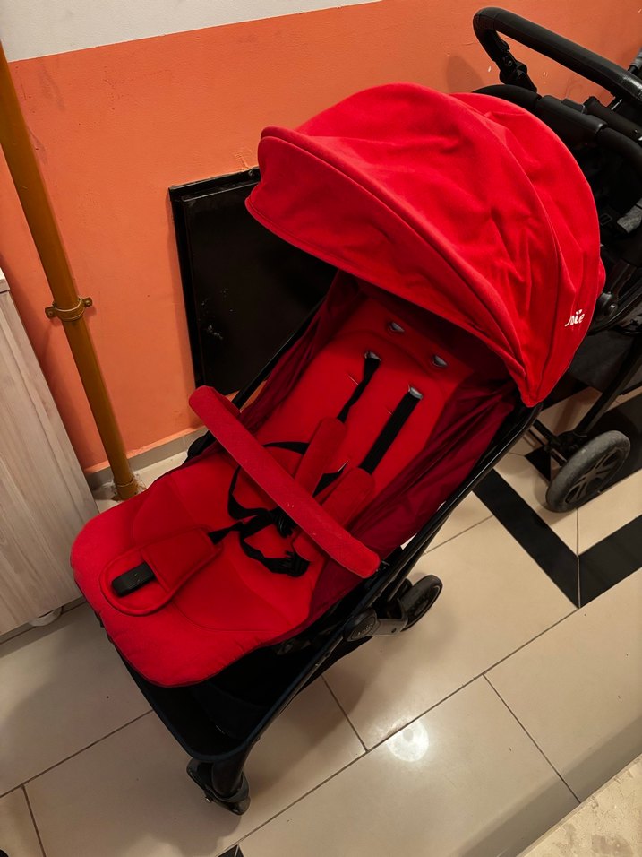 Koyu kırmızı renkli, emniyet kemerli oturma yeri ve gölge sağlayan tente ile konforlu bebek arabası. Joie markasına ait fotoğrafta gözüktüğü gibi güneş solması mevcut ekledim